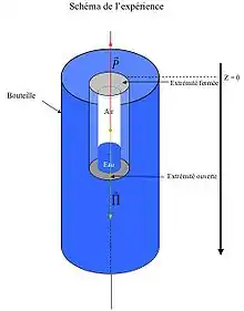 Intéressons nous maintenant à la pression exercée par la surface d’eau sur la surface d’air. Celle-ci se décompose en deux parties : la pression hydrostatique (celle subit par les plongeurs) et la pression exercée par le manipulateur. Si on considère l’eau comme un fluide incompressible, alors la totalité de la force exercée sur les parois de la bouteille est transmise sur la surface air-eau.