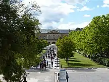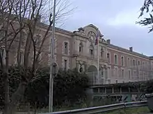 Le corps principal du bâtiment, bâti en pierre de taille avec couverture en ardoise, date des années 1880. À l'origine, il s'agissait de l'ancienne « caserne du Polygone » dont on peut remarquer le trophée d'armes et de drapeaux au sein du fronton central.