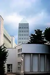 Les murs extérieurs du bâtiment donnent l’impression d’être des murs d’enceinte… L’extérieur présente l’apparence d’une construction pure et lisse. L’édifice a des lignes agrémentées de colonnes ruinées, d’un obélisque, d’une porte sur la rue. Le tout recouvert d’une céramique blanche avec laquelle jouent la lumière et le temps. Ainsi sont matérialisées les limites entre la vieille ville et la nouvelle cité. L’obélisque est un signal d’identification qui est reconnu de loin : face aux clochers de la vieille ville, il marque la vitalité de la ville nouvelle. Par contre l’intérieur est polychrome et convivial. C’est une tranche de ville qui s’organise le long d’une rue couverte intérieure, lieux d’échanges et de communications. Au rez-de-chaussée sont les équipements publics, les étages sont réservés à des activités nécessitant plus de calme. On a aussi pu parler de la rue de clin d’œil Hollywoodien s’opposant à la rigueur néoclassique de l’extérieur.