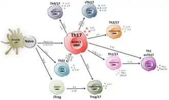 Les lymphocytes Th17, caractérisées par l'expression des cytokines interleukine 17 A et F, interleukine 10, interleukine 21, interleukine 22 et interleukine 23, et du facteur de transcription principal RAR-related orphan receptor gamma [25],contribuent à la protection contre pathogènes extracellulaires, en particulier au niveau des muqueuses ,103 ainsi que l'inflammation chronique et les maladies auto-immunes [26]. L'interleukine 6 et le facteur de croissance transformant-β pilotent la différenciation des cellules Th17 tandis que l'interleukine 21 et l'interleukine 23 stabilisent la lignée Th17 [27],[28].. L'interleukine 6 induit l'expression du RAR-related orphan receptor gamma par phosphorylation de STAT3, tout en inhibant l'expression de FOXP3 induite par le facteur de croissance transformant [29]. le RAR-related orphan receptor gamma induit l'expression de interleukine 17 A et F, interleukine 22 et interleukine 23 en ciblant directement leurs promoteurs [30]. L'interleukine 21 autocrine active STAT3 via l'activation de la Janus kinase, ce qui peut encore augmenter l'expression de l'interleukine 23 et conférer une réactivité à l'interleukine 23 des cellules Th17 [31]. L'interleukine 23 améliore ensuite l'activation de STAT3 pour stabiliser le développement de Th17 [32].Des études récentes ont révélé un grand degré de plasticité des cellules Th17 en fonction de la présence de facteur de croissance transformant-β. Le facteur de croissance transformant-β et l'interleukine 6 induisent les cellules Th17 « classiques » caractérisées par la production d'interleukine 10 , 17 et 21, tandis que l'interleukine 6 , l'interleukine 1β et l'interleukine 23 induisent des Th17 « pathogènes ». cellules produisant des niveaux élevés d'interféron, de facteur stimulant les colonies de granulocytes et de macrophages et d'interleukine 22 [33],[34].
