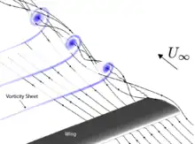 - instabilité de cisaillement bidimensionnelle pour des profils de vitesse perpendiculaire à l'écoulement ayant un point d'inflexion (instabilité de Kelvin-Helmholtz). Le tourbillon généré est dans le plan de l'écoulement ;