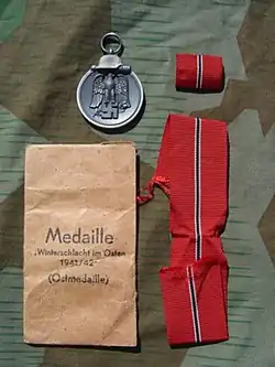 Médaille en zinc, avec sur l'endroit un aigle allemand tenant une croix gammée entre ses serres, et au verso, le texte « Winterschlacht Im Osten 1941/42 », et au-dessous une épée croisant une branche de lauriers de la victoire. Au-dessus de la médaille, le casque de l'armée allemande la reliait au ruban dans un acier poli.