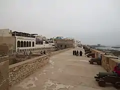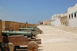- remparts de plus de 200 m de long, côté atlantique, de style Vauban, avec des plates-formes d'artillerie Sqala de la Kasbah, et Sqala du Port, avec échauguettes, et batterie d'une vingtaine de vieux canons espagnols historiques en bronze du XVIIIe siècle...