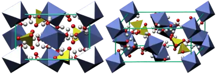 | Habitus | Rares cristaux dans la nature, cristaux prismatiques courts, pseudo-octaèdres, tabulaires ou aciculaires ; agrégats de cristaux aciculaires, tabulaires épais, agrégats fibreux, formations le plus souvent en concrétions ou en stalactites ; nodules à faciès massif (souvent trace de Cu) ; véritables masses rocheuses souvent pulvérulentes sous pression ; encroûtement à structure pulvérulente, en efflorescence, poudres. |