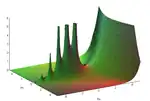 En matière de surface de Riemann, une fonction méromorphe est comme une fonction holomorphe du plan complexe dans la sphère de Riemann qui n'est pas la constante infinie. Les pôles correspondent aux nombres complexes qui sont envoyés sur ∞.