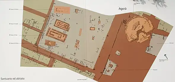 La ville et son organisation territoriale sont connues par les nombreuses fouilles réalisées aux XIXe et XXe siècles. Son monument le plus célèbre est le temple d'Héra, aussi appelé « Tables Palatines » (Tavole Palatine). On connaît par ailleurs de nombreuses nécropoles périurbaines et rurales (Pantanello, fouillée par diverses équipes américaines dans la seconde moitié du XXe siècle), attestant d'une organisation cadastrale de la chôra de la cité, en lien avec le plan hippodaméen du centre urbain.