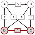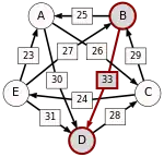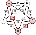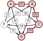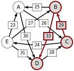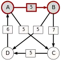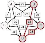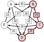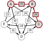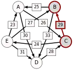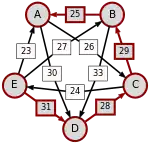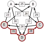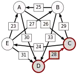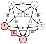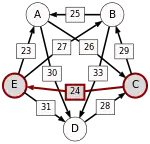 La victoire la plus serrée est celle de E sur A (une voix d’avance seulement). L’arc correspondant, qui a la pondération la plus faible (1), est enlevé. Le graphe modifié est alors le suivant :