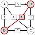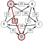 - p[A,B] : = max { min { d[C(i),C(i+1)] | i = 1,...,(n-1) } | C(1),...,C(n) est un chemin de A vers B }