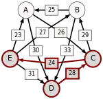 Pour un tel scrutin, il n’y a pas de vainqueur de Condorcet. Un rangement par paires décroissantes conduirait à l'élection de A, tandis que la méthode Black élirait E. La méthode de Schulze, présentée ci-après, conduit également à l’élection de E.