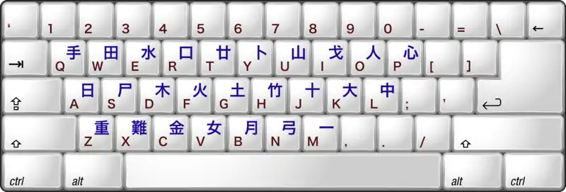 Les touches permettant de saisir ces radicaux sont divisées en quatre groupes : le bloc des sinogrammes philosophiques (de A à G, représentant le soleil, la lune et les cinq éléments), le bloc des traits (de H à N, représentant des traits simples), le bloc des parties du corps (de O à R, représentant des parties du corps humain) et le bloc des formes (de S à Y, représentant des formes complexes présentes dans les sinogrammes).