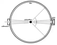 La chambre de Debye-Scherrer est un dispositif relativement simple, qui consiste en une chambre de forme cylindrique, un porte échantillon positionné en son centre et une source monochromatique.