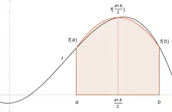 Cette méthode utilise l'approximation d'ordre 2 de f par un polynôme quadratique P prenant les mêmes valeurs que f aux points d'abscisse a, b et m = (a + b)⁄2. Pour déterminer l'expression de cette parabole (polynôme de degré 2), on utilise l'interpolation lagrangienne. Le résultat peut être mis sous la forme :