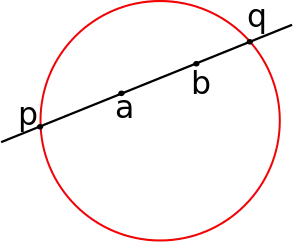 On fixe une quadrique Q d'un espace projectif E sur le corps des complexes ; Q est appelée la quadrique absolue de la géométrie qu'on veut définir. Si a et b sont deux points distincts de E, non dans Q, la droite (a,b) intersecte Q en deux autres points p et q[10]. La distance de Cayley–Klein d(a,b) est proportionnelle au logarithme du birapport (a,b ; p,q)[11] : , où est une constante.