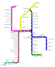 La ligne 50 du métro d'Amsterdam assure une liaison semi-circulaire entre le sud-est et l'ouest. Les lignes 51, 53 et 54 disposent d'un tronc commun de leur terminus à la gare centrale jusqu'à la station Spaklerweg, sur la rive droite de l'Amstel. Elles desservent ensuite différents lieux du sud de la ville : respectivement la gare d'Amsterdam-Sud puis l'ouest de la ville conjointement avec la ligne 50 pour la ligne 51, les alentours de la rivière Gaasp pour la ligne 53, ainsi que le quartier du Bijlmermeer, également au côté de la ligne 50, pour la ligne 54. La ligne 52, qui joint l'arrondissement Nord et la gare d'Amsterdam-Sud, doit à terme atteindre la gare de l'aéroport d'Amsterdam-Schiphol dans la commune de Haarlemmermeer au sud-ouest[3]. Du fait de sa conception récente, elle est la seule ligne à ne pas partager de tronçon avec une autre ligne.