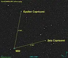 M30 est à environ 3,8 degrés au sud-est de Epsilon Capricorni, une étoile de magnitude 4,62, et à quelque 3,2 degrés au sud-est de Zeta Capricorni, une étoile de magnitude 3,77.