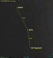 M75 est à environ 7,9° au sud-ouest de l'étoile Dabih (Beta Capricorni) et 5,8° au nord-est de 62 Sagittarii.
