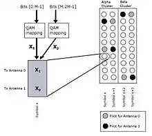 On considère un système MIMO composé de antennes à l'émission et de antennes à la réception. On note le vecteur de taille contenant les symboles envoyés et le vecteur contenant les symboles reçus[2]. La relation qui relie et s'écrit alors :