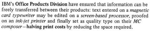- La machine à mémoire électronique — introduite par Canon — qui facilite les réutilisations et les corrections de texte ; elle devient une machine à traitement de texte avec la série Canon Starwriter, équipée d'un affichage à cristaux liquides, d'un lecteur-enregistreur de disquettes et d'un système d'impression à jet d'encre.