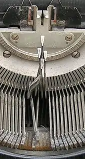 Les premières machines étaient entièrement mécaniques, sans processeur, sans électricité. Seulement des engrenages, des leviers, des ressorts, des articulations. Chaque lettre est gravée sur un petit bloc de métal appelé caractère, soudé au bout d'une tige rigide appelée « barre à caractère ». L'appui décale légèrement sur la gauche sous l'effet d'un ressort afin que la lettre suivante vienne s'imprimer légèrement à droite, et le ruban encreur se décale aussi, afin que le caractère suivant soit correctement encré, à une portion neuve.