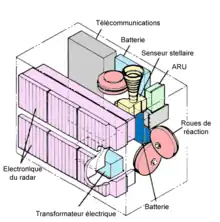 - le compartiment avant, formant un parallélépipède rectangle de 1,7 × 1 × 1,3 mètre en aluminium usiné chimiquement pour l'alléger, contient l'électronique du radar et des télécommunications ainsi que le système de contrôle d'attitude. La chaleur dégagée par ce compartiment qui consomme 200 watts électriques est évacuée par des persiennes ;