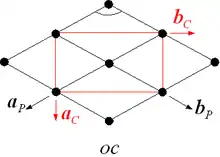 Exemple. Le réseau orthorhombique centré représenté ci-contre possède deux axes de symétrie d'ordre deux : l'un horizontal et l'autre vertical. La maille conventionnelle du réseau (maille rouge dans la figure) possède des côtés parallèles aux axes de symétrie du réseau, tandis que dans la maille primitive correspondante (maille noire dans la figure), les deux directions de symétrie sont bissectrices des axes (aP et bP).