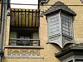 La façade possède trois oriels de dimensions différentes. Celui du rez-de-chaussée est le plus volumineux. Avec celui du premier étage, ils sont de base trapézoïdale alors que celui du second étage, plus petit, a une base triangulaire.