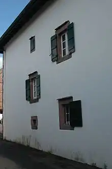Les volets pleins en bois à barre sont peints de la même couleur que les autres pièces de bois des façades ou de la charpente. Ils sont en général d’un rouge assez foncé dit rouge basque (à l’origine, le sang de bœuf était utilisé pour enduire les pièces de bois, mêlant un aspect rituel à l’aspect pratique - le sang de bœuf était renommé pour avoir des vertus protectrices contre les insectes et le pourrissement). On trouve également, à partir du XIXe siècle un bleu très foncé, sorte de bleu de Prusse, ou un vert « profond » également foncé, et parfois un gris très clair. À Arcangues, le marquis d’Arcangues a introduit un bleu plus clair. Les contrastes de la couleur avec le blanc chaulé (une fois par an, souvent en juin avant la Fête-Dieu) des murs confèrent à la façade cette légèreté distinctive et surprenante pour une maison relativement massive et imposante, qu’on ne retrouve pas en Basse-Navarre.