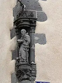 À l'angle de deux murs, à l’extérieur, une niche a été construite et abrite une statue. La niche, entourée de pilastres et composée d'un cul-de-lampe et d'un dais, est datable de la première renaissance[2]. Datée de 1550, cette niche abrite la statue de saint Antoine, mais n'est pas de la même époque que la niche[5]. La statue du saint est habillée de la robe de bure des moines marquée du Tau des Antonins. Il tient un livre ouvert et s'appuie sur un bâton sur lequel s'enroule son rosaire[3]. Il est accompagné d'un cochon, son animal familier, qui porte une clochette, comme c'était l'usage à cette époque là[1],[3].