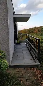 Afin de réduire les coûts, le rez-de-chaussée n'est pas un porte-à-faux en structure métallique. Un soubassement en béton est réalisé, encastré dans le relier de la vallée qui constitue le sous-sol. Un volume parallélépipédique contenant les pièces de vie est posé dessus avec une partie débordant contenant la loggia. Le volume semble plonger vers le paysage et depuis le living ou la loggia, donnant la même impression que le porte-à-faux de la maison Derwael depuis l'intérieur.