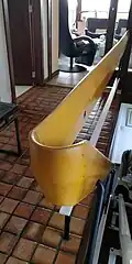 Les matériaux utilisés sont industriels. Les surfaces sont lisses. La structure colorée est apparente. Elle est basée sur un plan inversé; les locaux techniques sont situés en sous-sol. Les pièces de vie sont orientées vers l'ouest avec vue sur la vallée. Le sous-sol est un socle en béton sur lequel repose le parallélépipède contenant les pièces de vie. Il est en porte-à-faux grâce à l'ossature métallique et semble plonger dans la vallée.