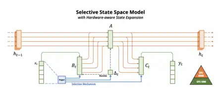 Mamba se dispense du mécanisme d'attention qui est au cœur des modèles Transformeur et "remplace la complexité des briques d'attention et de perceptron multicouche avec une brique SSM unifiée" afin de proposer une architecture simplifiée "réduisant la complexité computationnelle et accélérant la génération de nouvelles données[1]. À la différence des autres approches reposant sur des modèles à espace d'état ou des réseaux de neurones récurrents (RNN), Mamba est "sélectif" et filtre les données les moins pertinentes en entrée pour générer des données nouvelles[1].