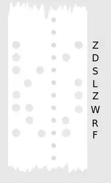 Le mathématicien Alan Turing, qui avait été nommé au poste symbolique de directeur adjoint au laboratoire des machines à calculer de l'université de Manchester en [10] , inventa un schéma de codage en base 32 basé sur le code Baudot, un standard pour les téléscripteurs, grâce auquel les programmes et les données pouvaient être lus et écrits sur le ruban de papier[18]. Le code Baudot associe un seul caractère à chacune des 32 (25) valeurs qui peuvent être représentées sur 5 bits. Ainsi, « 10010 » représente « D », « 10001 » représente « Z », et ainsi de suite. Turing ne changea que quelques-uns des codes standard ; par exemple, « 00000 » et « 01000 », qui signifient « aucun effet » et « retour à la ligne » dans le code de téléscripteur, étaient représentés par les caractères « / » et « @ », respectivement. Le zéro binaire, représenté par la barre oblique, était le caractère le plus fréquent dans les programmes et les données, ce qui produisait des séquences de la forme « /////////////// ». Un des premiers utilisateurs suggéra que le choix de Turing de la barre oblique était un choix subconscient de sa part, une représentation de la pluie vue à travers une vitre sale, reflétant le temps « réputé lugubre » de Manchester[19].