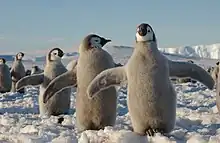 La coquille de l'œuf étant relativement épaisse, l'éclosion peut durer entre deux et trois jours. Les oisillons sont semi-nidicoles, couverts seulement d'une fine couche de duvet et entièrement dépendants de leurs parents pour se nourrir et maintenir leur température[48]. Si le jeune éclot avant le retour de la mère, le père le nourrit par régurgitation avec une sécrétion composée de 59 % de protéines et 28 % de lipides, produite par une glande de son œsophage et parfois appelée « lait de manchot»[49].