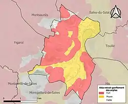 La commune est vulnérable au risque de mouvements de terrains constitué principalement du retrait-gonflement des sols argileux[32]. Cet aléa est susceptible d'engendrer des dommages importants aux bâtiments en cas d’alternance de périodes de sécheresse et de pluie. 92,7 % de la superficie communale est en aléa moyen ou fort (88,8 % au niveau départemental et 48,5 % au niveau national). Sur les 469 bâtiments dénombrés sur la commune en 2019, 466 sont en aléa moyen ou fort, soit 99 %, à comparer aux 98 % au niveau départemental et 54 % au niveau national. Une cartographie de l'exposition du territoire national au retrait gonflement des sols argileux est disponible sur le site du BRGM[33],[Carte 3].