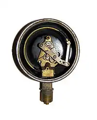 - Pivot de l'aiguille indicatrice du cadran. Il engrène sur le secteur denté (7) et traverse la plaque du châssis pour entraîner l'aiguille de lecture. Compte tenu du très faible bras de levier entre l'axe du balancier et du taux de réduction du pignon d'engrenages, les moindres déformations du tube de Bourdon sont fort amplifiées et se traduisent par un mouvement bien détectable de l'aiguille.
