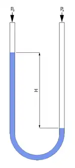 Les manomètres à colonne de liquide consistent en une colonne verticale de liquide piégée dans un tube dont les extrémités sont soumises à deux pressions différentes. Selon la différence de pression appliquée, la colonne va monter ou descendre jusqu’à ce que son poids soit équilibré. Une version simple est le tube en U rempli à moitié de liquide, et dont une extrémité est raccordée à l’enceinte à tester tandis que l’autre extrémité est soumise à une pression de référence (à savoir la pression atmosphérique ou le vide). La différence de niveau du liquide marque la pression appliquée par l’enceinte par rapport à la pression de référence. En effet, la pression exercée par une colonne de liquide de hauteur h et de densité ρ est donnée par la formule du nivellement barométrique P = ρgh. C’est pourquoi l’écart entre la pression appliquée Pa et la pression de référence P0 dans un manomètre à tube en U s’obtient avec la relation Pa − P0 = ρgh. En d’autres termes, la pression à chaque extrémité de la colonne liquide (en bleu à droite sur la figure) doit être équilibrée (puisque le liquide est au repos) et par conséquent Pa = P0 + ρgh. Si le fluide dont on veut mesurer la pression est suffisamment dense, il faut introduire des corrections hydrostatiques sur la hauteur lue en fonction du point où le manomètre mesure la pression, à moins que l’on ne mesure la pression différentielle d’un fluide (par exemple au niveau d’un ajutage ou d’un canal de Venturi) : dans ce dernier cas, il faudra retrancher de la densité ρ du liquide manométrique la densité du fluide dont on mesure la pression interne[3].