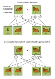 L'élevage du Manx est délicat, d'une part parce qu'une chatte donne naissance à peu de chatons et d'autre part par l'aspect génétique. En effet, un Manx homozygote (porteur de deux allèles responsables de l'absence de queue) n'est pas viable, puisque la moelle épinière ne se développe pas complètement. Tous ces chatons meurent dans l'utérus et ceux qui naissent sont donc soit hétérozygotes et dépourvus de queue, soit homozygotes sains, porteurs de deux allèles fonctionnels du gène et naissant donc avec une queue. On ne peut pas non plus accoupler deux Manx rumpy car il est possible de faire apparaître un gène létal. Il est donc conseillé de les accoupler avec des British Shorthair ou Longhair pour éviter le problème, mais dans ce cas, tous les chatons de la portée ne naitront pas Manx.