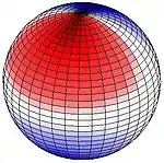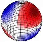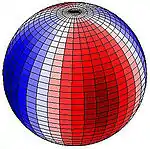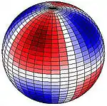 La marée semi-diurne (un maximum toutes les 12 heures environ) est principalement lunaire (seul S 2 est purement solaire) et donne lieu à des déformations sectorielles qui montent et descendent en même temps le long de la même longitude[16]. Les variations sectorielles des déplacements verticaux et est-ouest sont maximales à l'équateur et disparaissent aux pôles. Il y a deux cycles le long de chaque latitude, les renflements opposés et les dépressions également opposées. La marée diurne est lunisolaire et donne lieu à des déformations tessérales. Le mouvement vertical et est-ouest est maximal à 45° de latitude et nul à l'équateur et aux pôles. La variation tessérale a un cycle par latitude, un renflement et une dépression ; les renflements sont opposés (antipodaux), c'est-à-dire que la partie ouest de l'hémisphère nord et la partie est de l'hémisphère sud, par exemple, et de même les dépressions s'opposent, la partie est de l'hémisphère nord et la partie ouest de l'hémisphère sud, dans ce cas. Enfin, les marées bimensuelles et semi-annuelles ont des déformations zonales (constantes le long d'un cercle de latitude), car la gravitation de la Lune ou celle du Soleil est dirigée alternativement loin des hémisphères nord et sud en raison de l'inclinaison. Il n'y a aucun déplacement vertical à 35° 16' de latitude.