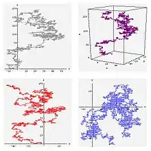 La galerie ci-dessous contient quatre spécimens de marches aléatoires isotropes sur le plan ℝ2 après 10 000 pas, partant de l'origine.