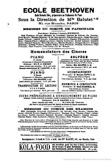 En novembre 1893[2] elle crée « l'École Beethoven » au sein de son vaste domicile du 80 rue Blanche à Paris, avec deux objectifs : permettre aux jeunes filles de faire des études musicales complètes, mais aussi, et peut-être surtout, dans la mesure où l'idée est une réelle innovation[9], instituer une école normale de formation pour futures enseignantes de piano[10]. Le cursus, nommé « cours préparatoire à l'enseignement du piano », est ainsi organisé en plusieurs enseignements et propose des séances de pédagogie, théorie, histoire de la musique, analyse et audition d’œuvres[8]. En fin de cursus un examen permet l'obtention d'un « certificat de capacité », validé par des grands maîtres de l'instrument et de la composition musicale. Sont par exemple au jury pour les examens de 1895 Guilmant, Leroux, Maréchal, Pierné, René et Vidal[11].