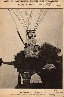 Brevetée pilote aéronaute le , c’est le que Mme Surcouf exécute à bord du ballon « Bengali », son premier vol en tant que pilote, accompagnée de Mlle Gache, la secrétaire du Comité. Ce vol, il s’agit du premier vol d’un équipage féminin, va mener les deux femmes du Parc des Coteaux de Saint-Cloud, à Neuilly sur Marne et ce en 2h45 de vol.[11]
