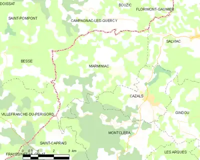 Marminiac est limitrophe de sept autres communes, dont trois dans le département de la Dordogne. Au nord-est, le territoire communal est distant de 200 mètres de celui de Florimont-Gaumier, et au nord-ouest, de 400 mètres de celui de Saint-Pompont.