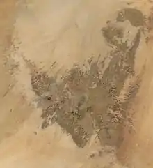 Image satellite du Tarso Toussidé avec notamment le pic Toussidé au centre de la tache sombre et le Trou au Natron en haut à gauche.