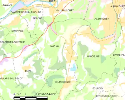 Mathay est située le long du Doubs. Elle fait face à Mandeure, l’antique Epomanduodurum romaine.