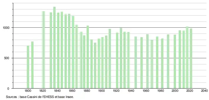 L'évolution du nombre d'habitants est connue à travers les recensements de la population effectués dans la commune depuis 1800. Pour les communes de moins de 10 000 habitants, une enquête de recensement portant sur toute la population est réalisée tous les cinq ans, les populations légales des années intermédiaires étant quant à elles estimées par interpolation ou extrapolation[20]. Pour la commune, le premier recensement exhaustif entrant dans le cadre du nouveau dispositif a été réalisé en 2006[21].