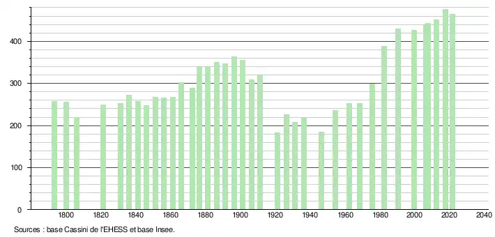 L'évolution du nombre d'habitants est connue à travers les recensements de la population effectués dans la commune depuis 1793. Pour les communes de moins de 10 000 habitants, une enquête de recensement portant sur toute la population est réalisée tous les cinq ans, les populations légales des années intermédiaires étant quant à elles estimées par interpolation ou extrapolation[25]. Pour la commune, le premier recensement exhaustif entrant dans le cadre du nouveau dispositif a été réalisé en 2007[26].