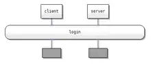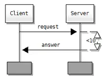 - Flot de contrôle: flèche horizontale avec le préfixe 'call', flèche en pointillée pour le retour, symbole de suspension ou d'appel de méthode entre les deux.