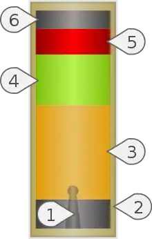 ![]() Anatomie d'une propulseur. Il mesure environ 7,5 cm de haut pour 1,7 cm de diamètre. 1. Tuyère ; 2. Emballage ; 3. Mèche de propulsion ; 4. Mèche lente ; 5. Charge de dépotage ; 6. Ciment de protection |