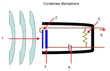 Schéma d'un microphone à condensateur. 1.Onde sonore, 2.Membrane avant, 3.Armature arrière, 4.Générateur, 5.Résistance, 6.Signal électrique.