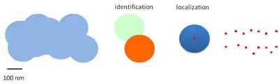L'idée de la microscopie PALM est de remplacer ce critère de séparation par un critère de localisation de source unique. La résolution au sens strict est donc remplacée par la localisation. Il s'agit alors de contrôler la fluorescence de molécules uniques, par stimulations courtes. Les molécules émettant de la lumière une par une, il est possible de séparer les photons venant de chaque émetteur. Lors d'un processus d'imagerie PALM, on enregistre pour traitement environ 10 000 images contenant les taches d'Airy résultant de l'observation des émetteurs par le microscope [5]. La localisation exacte de la position est alors réalisée par l'ajustement d'une fonction gaussienne en deux dimensions du profil d'émission.
